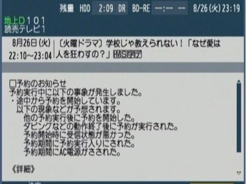 帰宅して録画が実行されてないのを不審に思ったが野球延長の可能性もあるかと思ったのだが…一体どうなってるんだ(泣)。 手動で電源ONにした時点で番組は既に開始していたのに、録画が開始されたのはそのさらに10分後って…。番組がどうこうじゃなくって、録画…